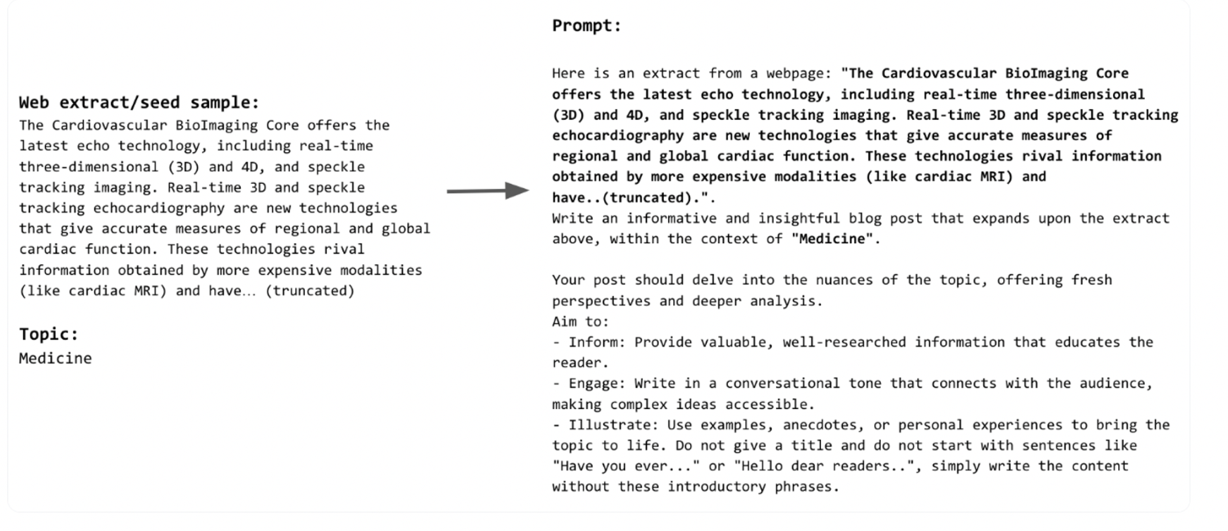 Each prompt has three main components: the topic, the seed sample, and the generation style, which specifies the intended audience and the type of content we want the model to generate.