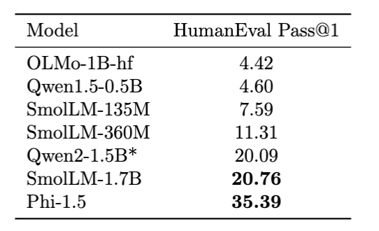 - SmolLM-1.7B shows strong Python coding performance with 24 pass@1. We note that the evaluation scorefor Qwen2-1.5B is different from the 31.1 pass@1 reported by Qwen team. We use temperature 0.2, top-p 0.95 with 20 samples.