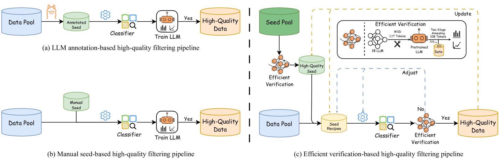• Efficient Verification Strategy: We propose a computationally efficient verification strategy that enables rapid evaluation of the impact of data on LLM training performance with minimal computational cost, significantly improving the efficiency of high-quality data filtering experiments.