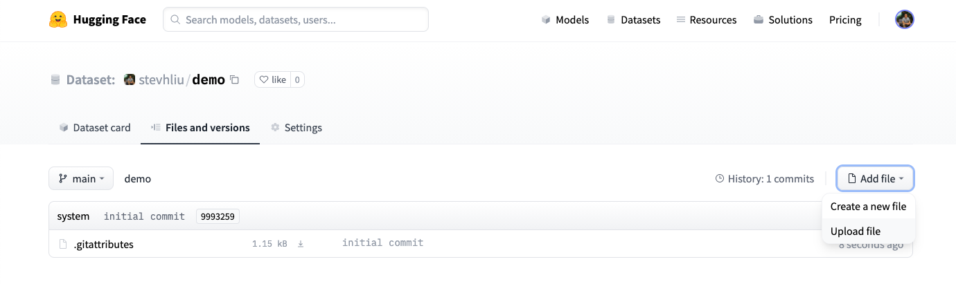 1. Once you’ve created a repository, navigate to the Files and versions tab to add a file. Select Add file to upload your dataset files. We support many text, audio, image and other data extensions such as .csv, .mp3, and .jpg (see the full list of File formats).