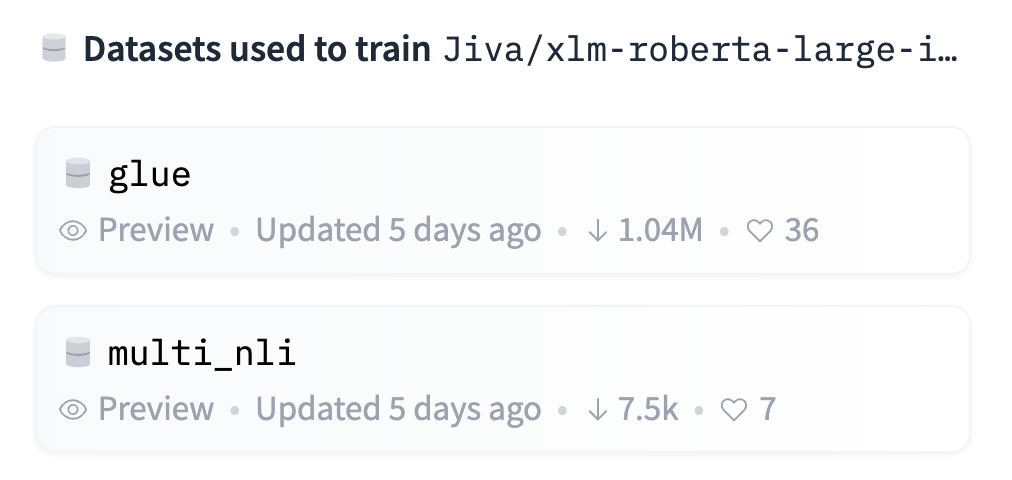 It’s up to the person who uploaded the model to include the training information! A user can specify the dataset used for training a model. If the datasets used for the model are on the Hub, the uploader may have included them in the model card’s metadata. In that case, the datasets would be linked with a handy card on the right side of the model page:
