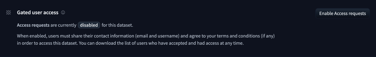 To enable access requests, go to the model settings page. By default, the model is not gated. Click on Enable Access request in the top-right corner.