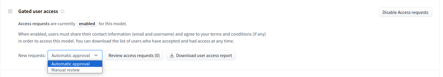 By default, access to the model is automatically granted to the user when requesting it. This is referred to as automatic approval. In this mode, any user can access your model once they’ve shared their personal information with you.
