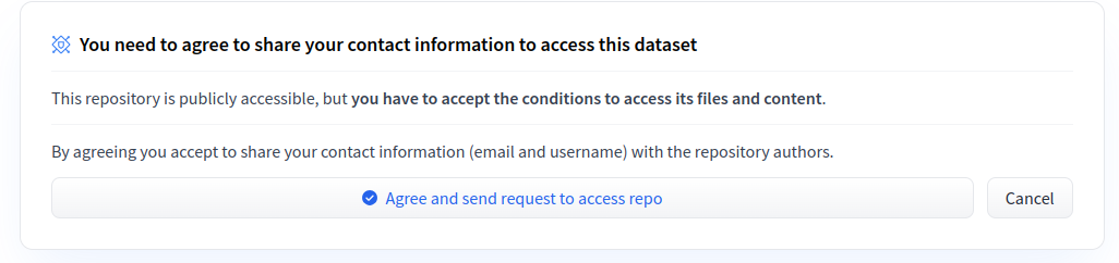 By default, users landing on your gated model will be asked to share their contact information (email and username) by clicking the Agree and send request to access repo button.