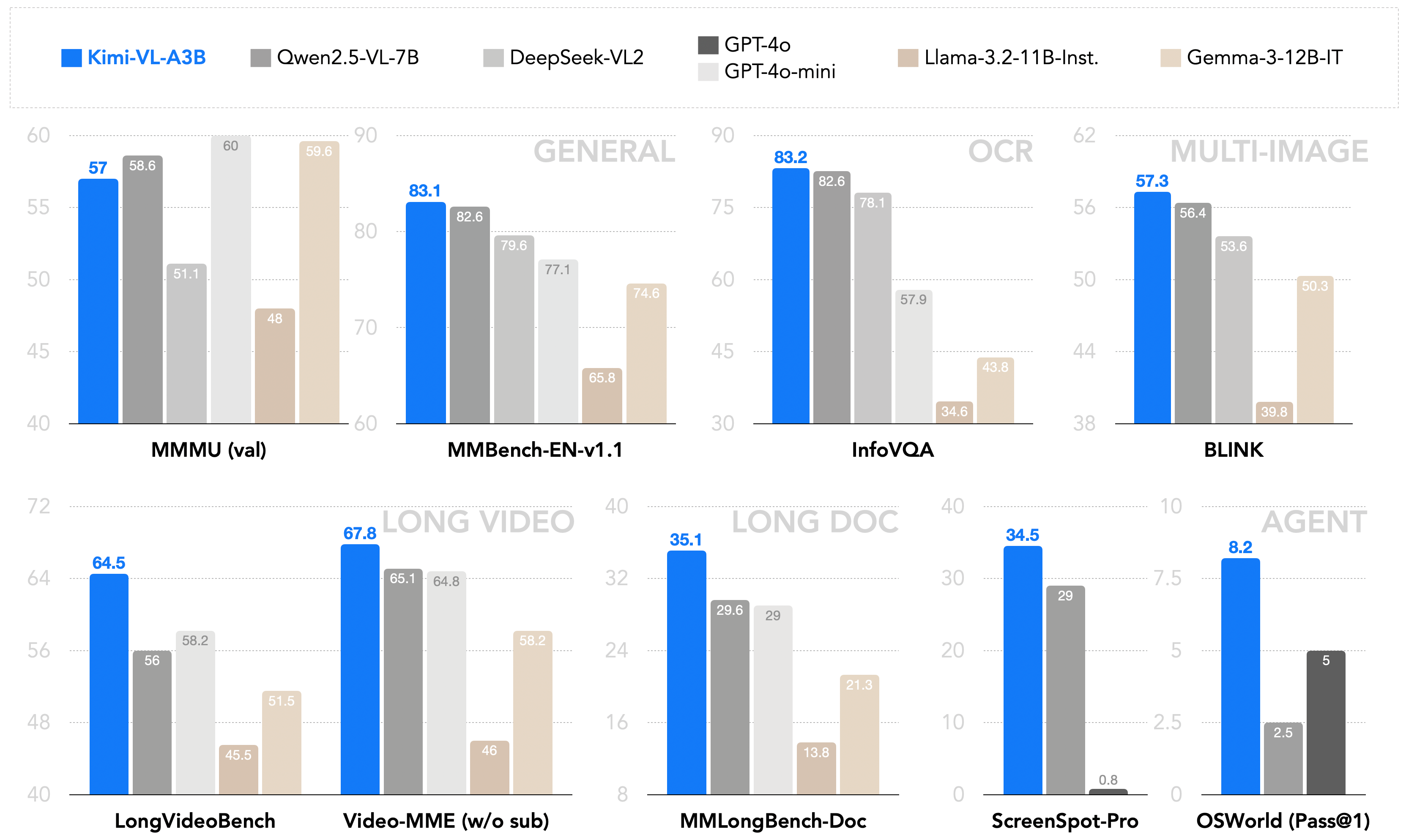 π€ For general multimodal perception and understanding, OCR, long video and long document, video perception, and agent uses, we recommend Kimi-VL-A3B-Instruct for efficient inference; for advanced text and multimodal reasoning (e.g. math), please consider using Kimi-VL-A3B-Thinking.