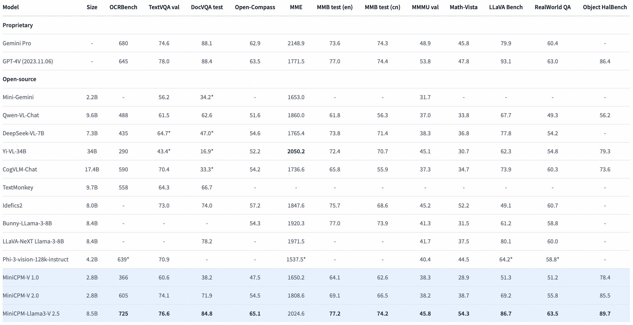 π₯ Leading Performance. MiniCPM-Llama3-V 2.5 has achieved an average score of 65.1 on OpenCompass, a comprehensive evaluation over 11 popular benchmarks. With only 8B parameters, it surpasses widely used proprietary models like GPT-4V-1106, Gemini Pro, Claude 3 and Qwen-VL-Max and greatly outperforms other Llama 3-based MLLMs.